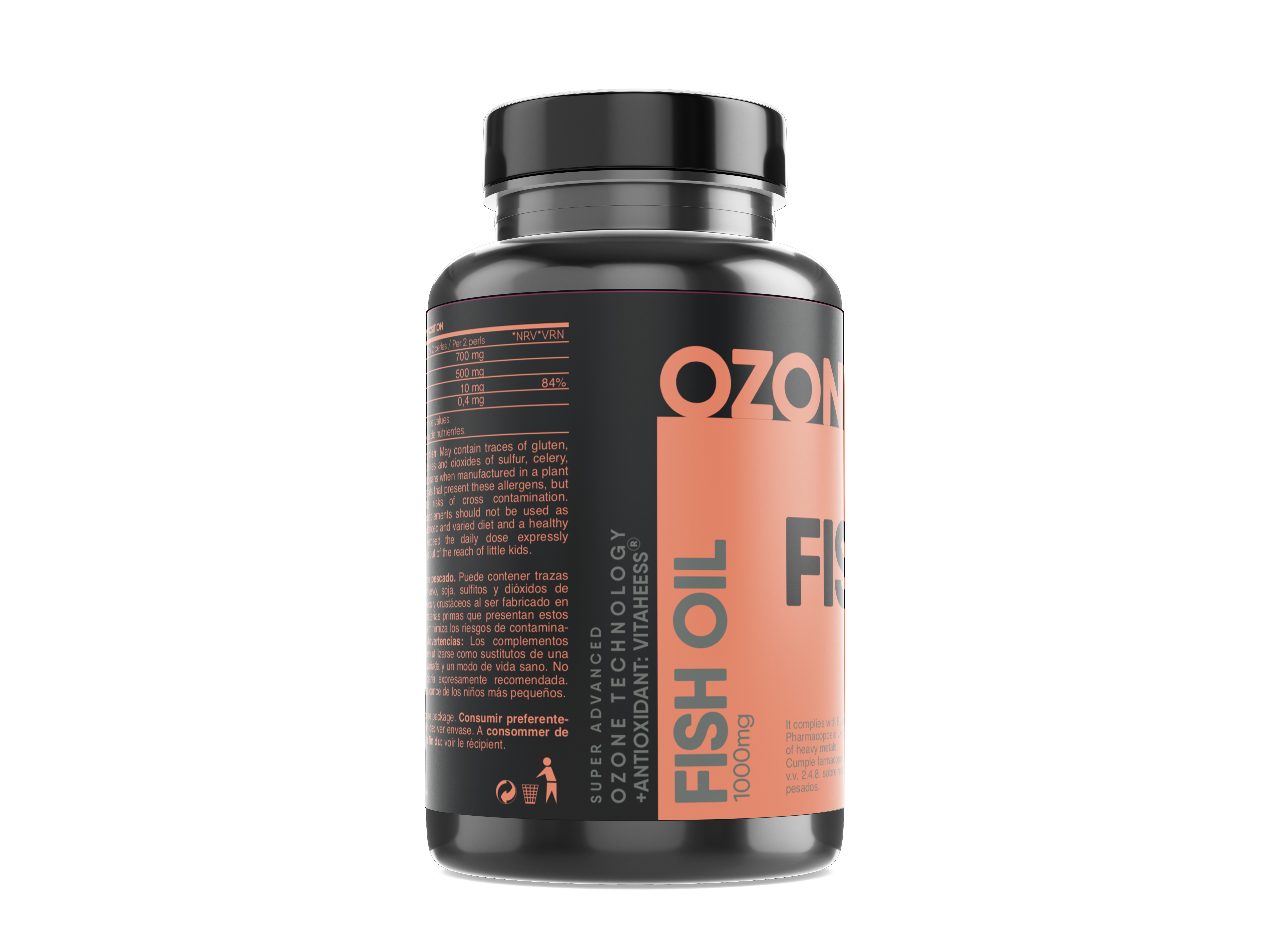 Ingredientes: Aceite de pescado (35% EPA y 25% DHA), Gelatina*, glicerina*, Vitamina E Natural (D-alfa tocoferol) y Vitaheess® (mezcla de antioxidantes (extracto rico en tocoferoles (E-306), palmitato de ascorbilo (E-304i) y galato de propilo (E-310)). *Componentes de la cápsula.