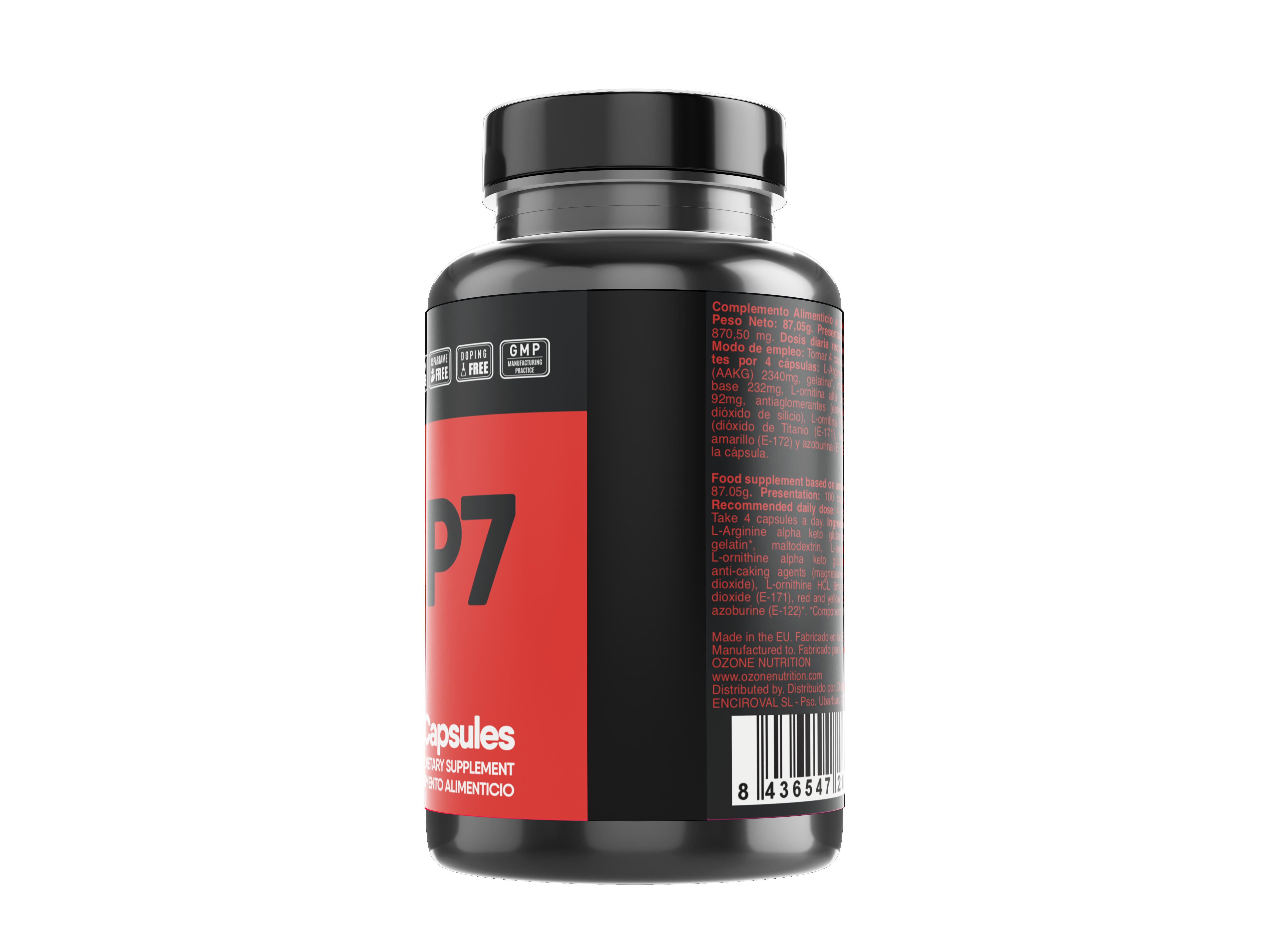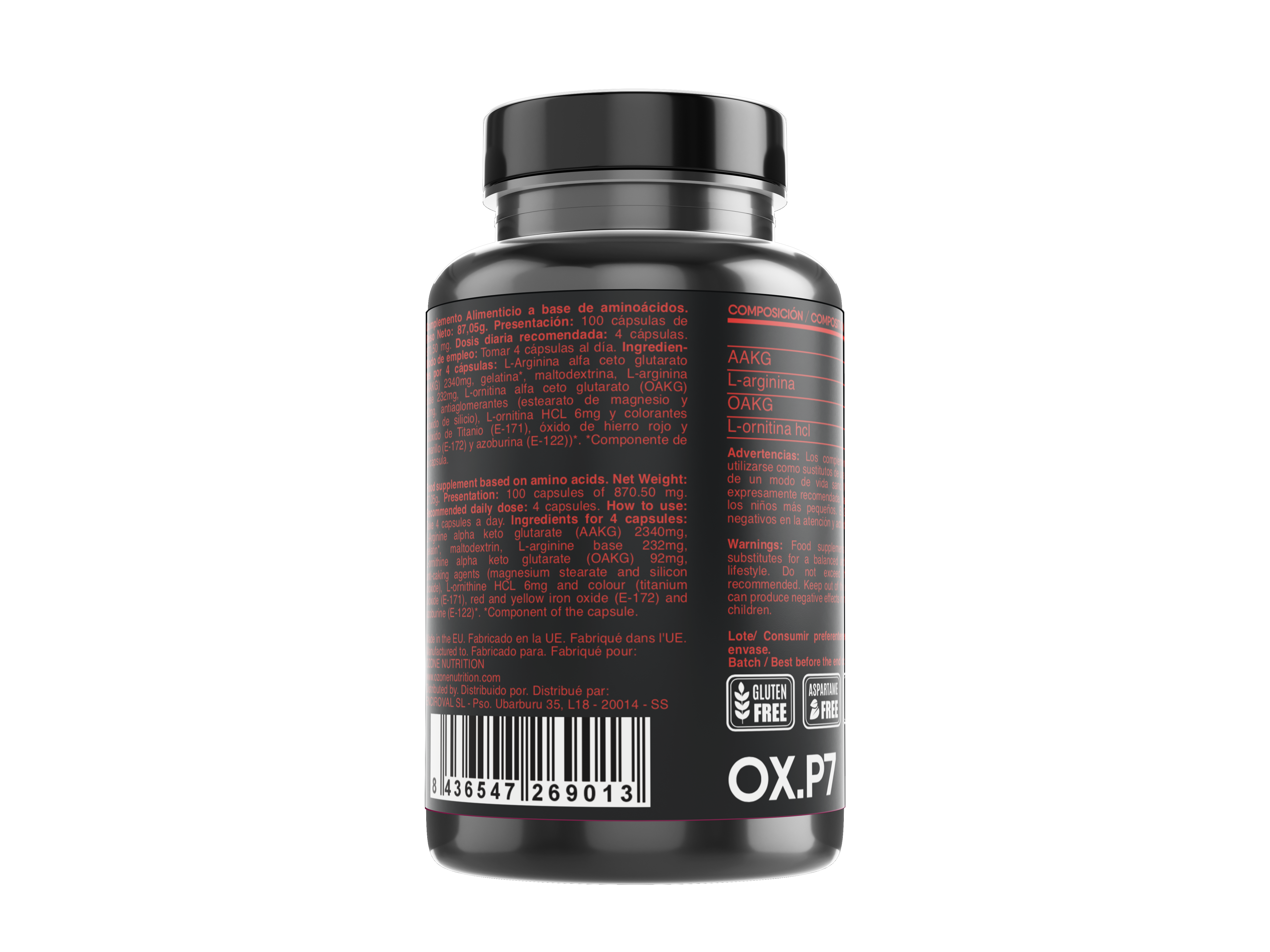 Ingredientes por 4 cápsulas: L-Arginina alfa ceto glutarato (AAKG) 2340mg, gelatina*, maltodextrina, L-arginina base 232mg, L-ornitina alfa ceto glutarato (OAKG) 92mg, antiaglomerantes (estearato de magnesio y dióxido de silicio), L-ornitina HCL 6mg y colorantes (dióxido de Titanio (E-171), óxido de hierro rojo y amarillo (E-172) y azoburina (E-122))*. *Componente de la cápsula.